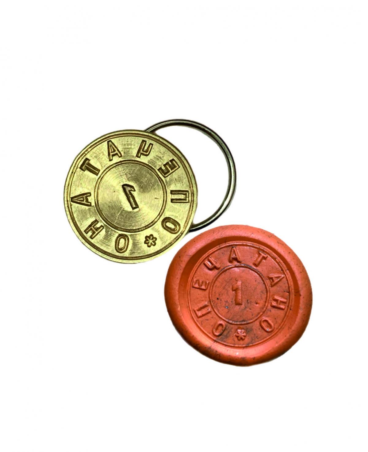 Латунная печать диаметром 22 мм. для опечатывания дверей, сейфов, хранилищ и других объектов с повышенной секретностью. используется вместе с опечатывающим устройством - чашкой для опечатывания.